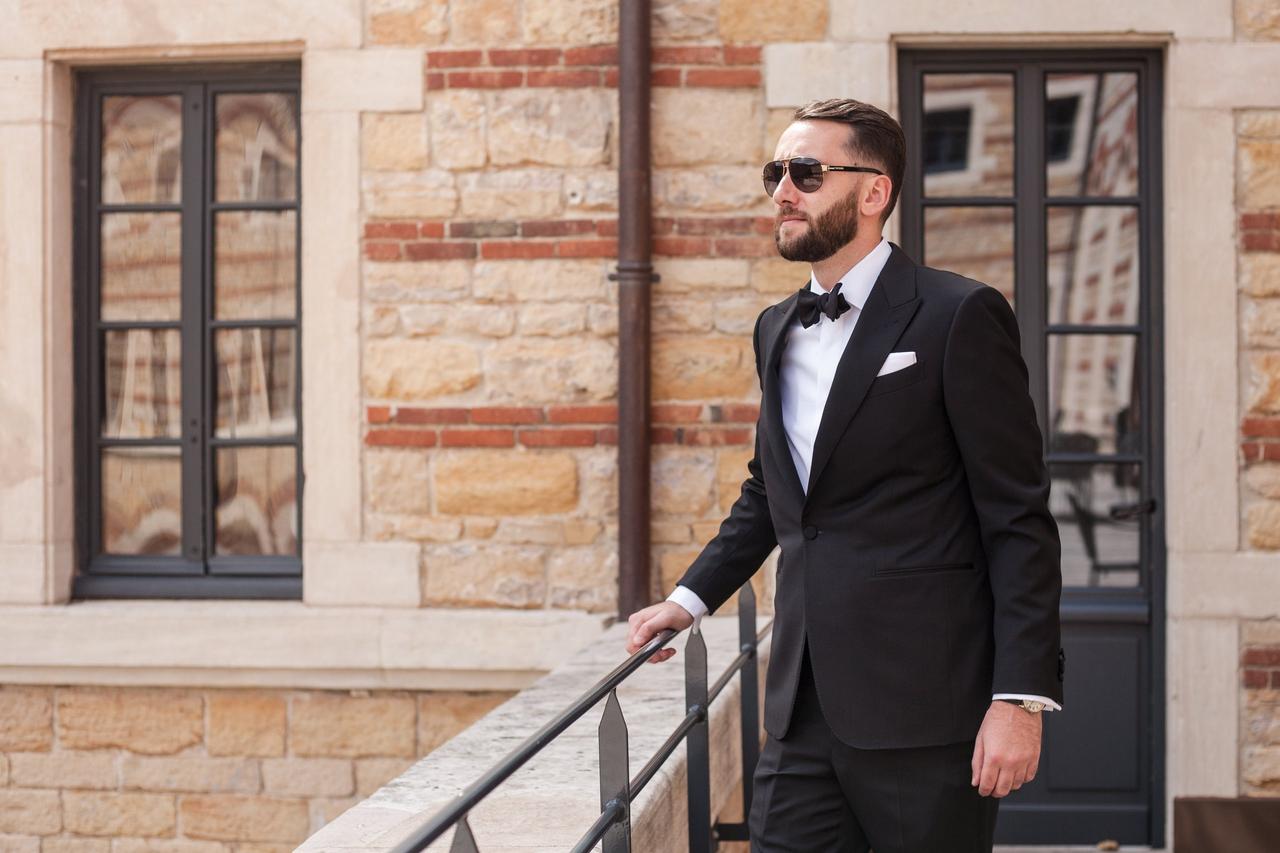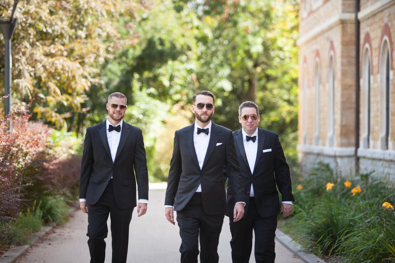 "On Dominic’s advice, we kept it simple. Black tux, white shirts (no buttons showing), black bowtie (no clip-ons). We all had cufflinks with our initials."