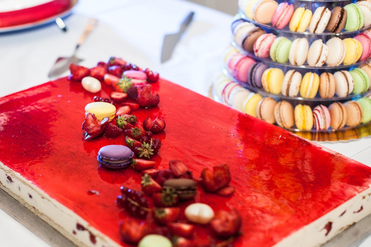 "Our wedding cake was a tiered cake alternating strawberry and cream tiers and praline, made by local baker Dallery. I’m still mad that I didn’t get a slice of praline (my favourite)!"
