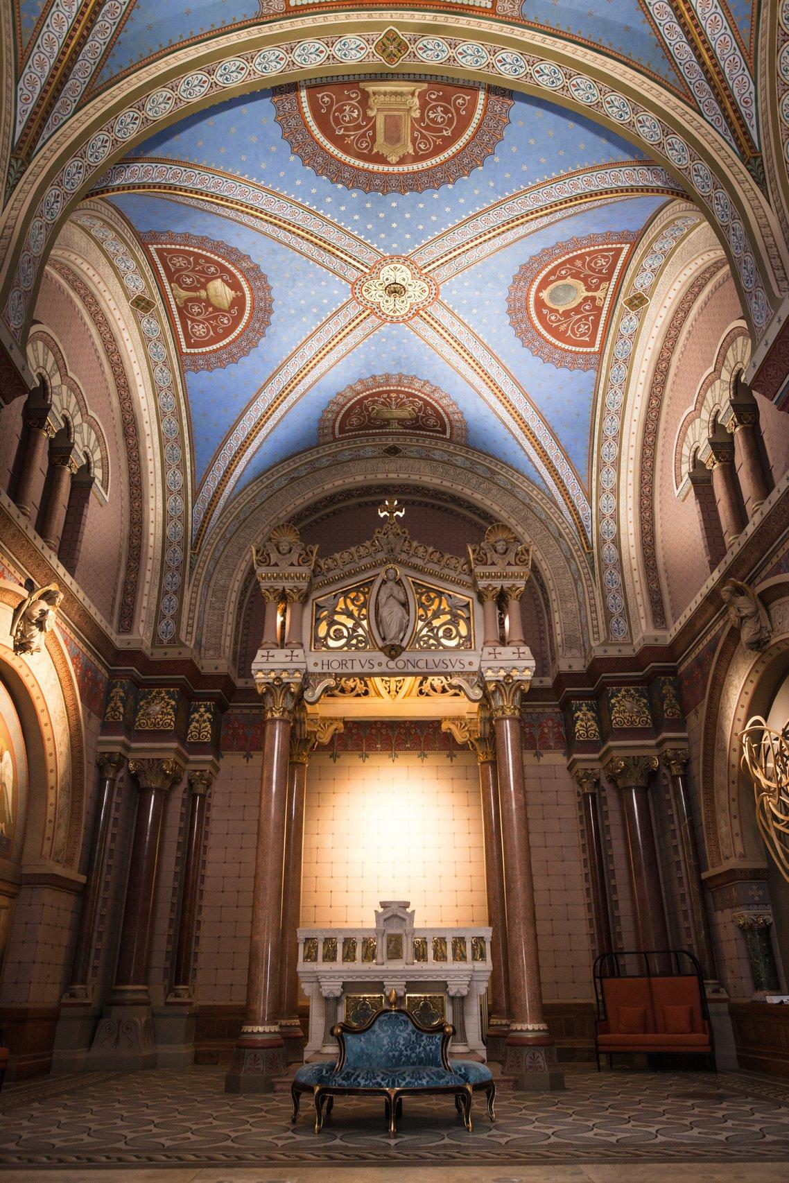 "The colour scheme was inspired by the pared back feel of the place, where the contemporary décor has a lot of nods to its monastic past. So I thought off-white and gold with red and navy accents, like a medieval manuscript from one of the French monasteries."