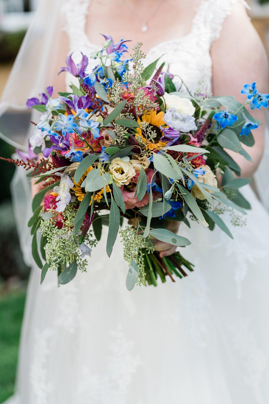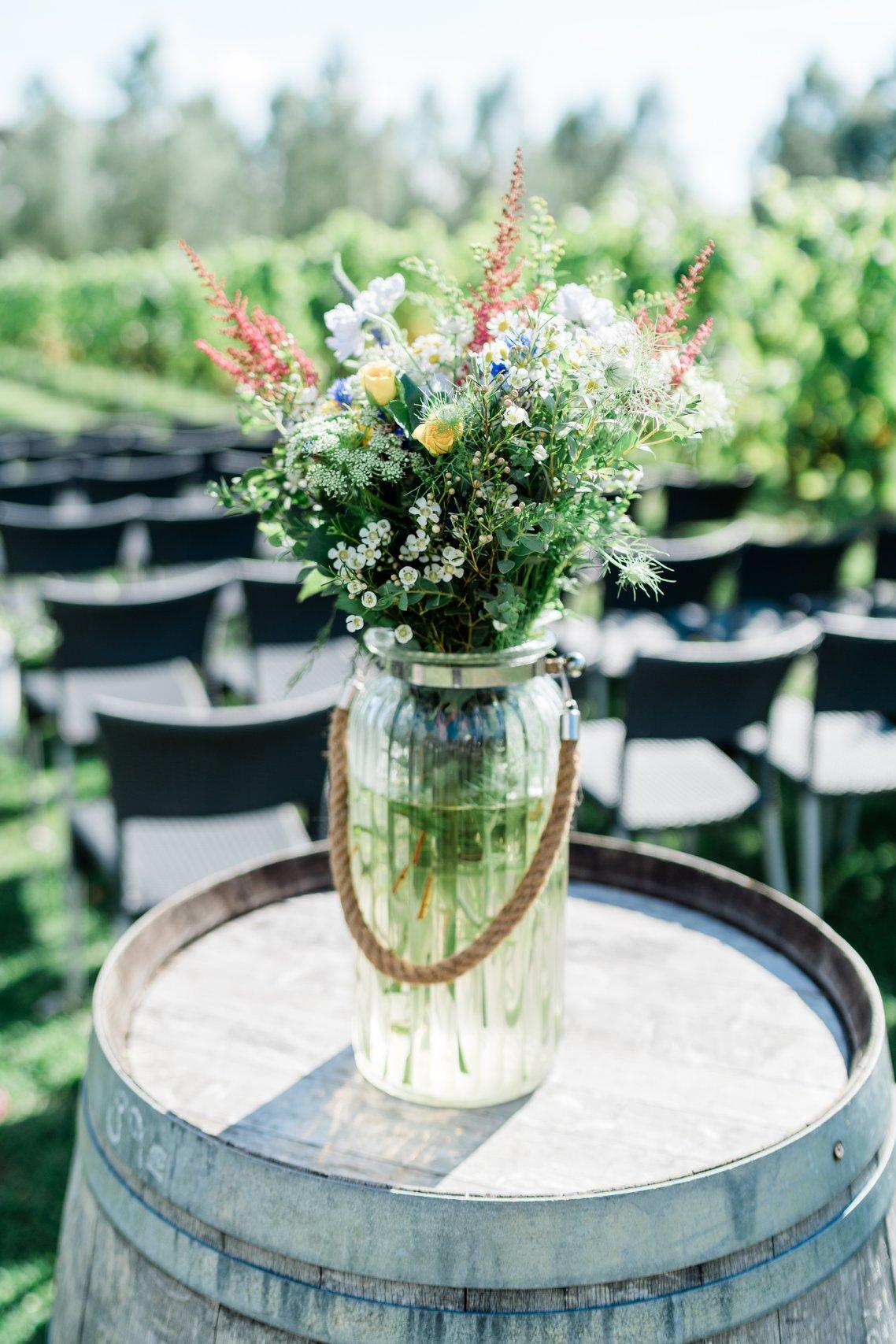 The venue and tables were dotted with sweet bundles of fresh flowers in the same yellows and blues of the bouquet, and arranged by Jane, the vineyard owner.