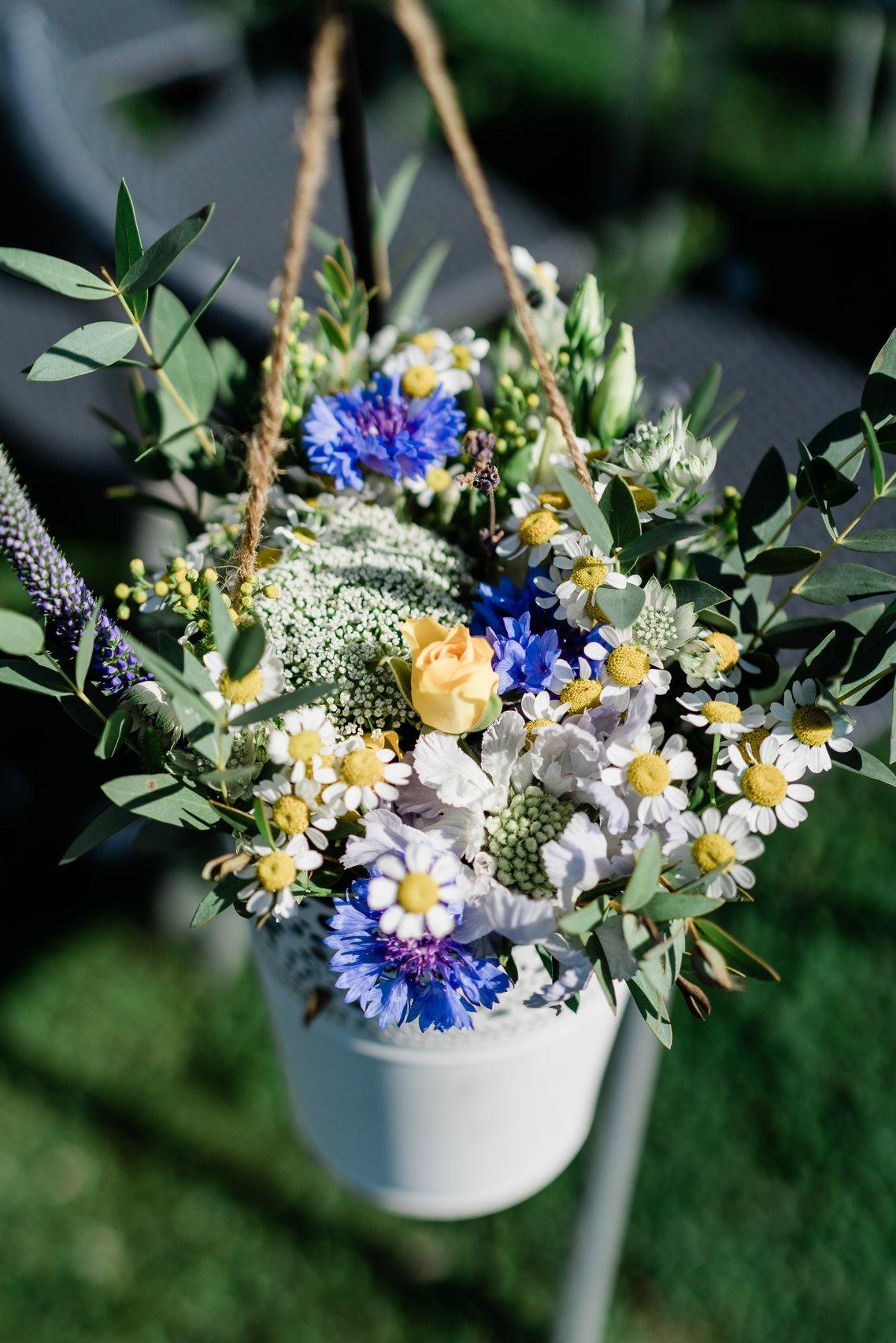 "Flowers were placed in little buckets at the end of the rows of chairs, on the inside of the aisle. The bouquet was better than I could ever have imagined. It had sunflowers in it and lots of bright wild flowers."