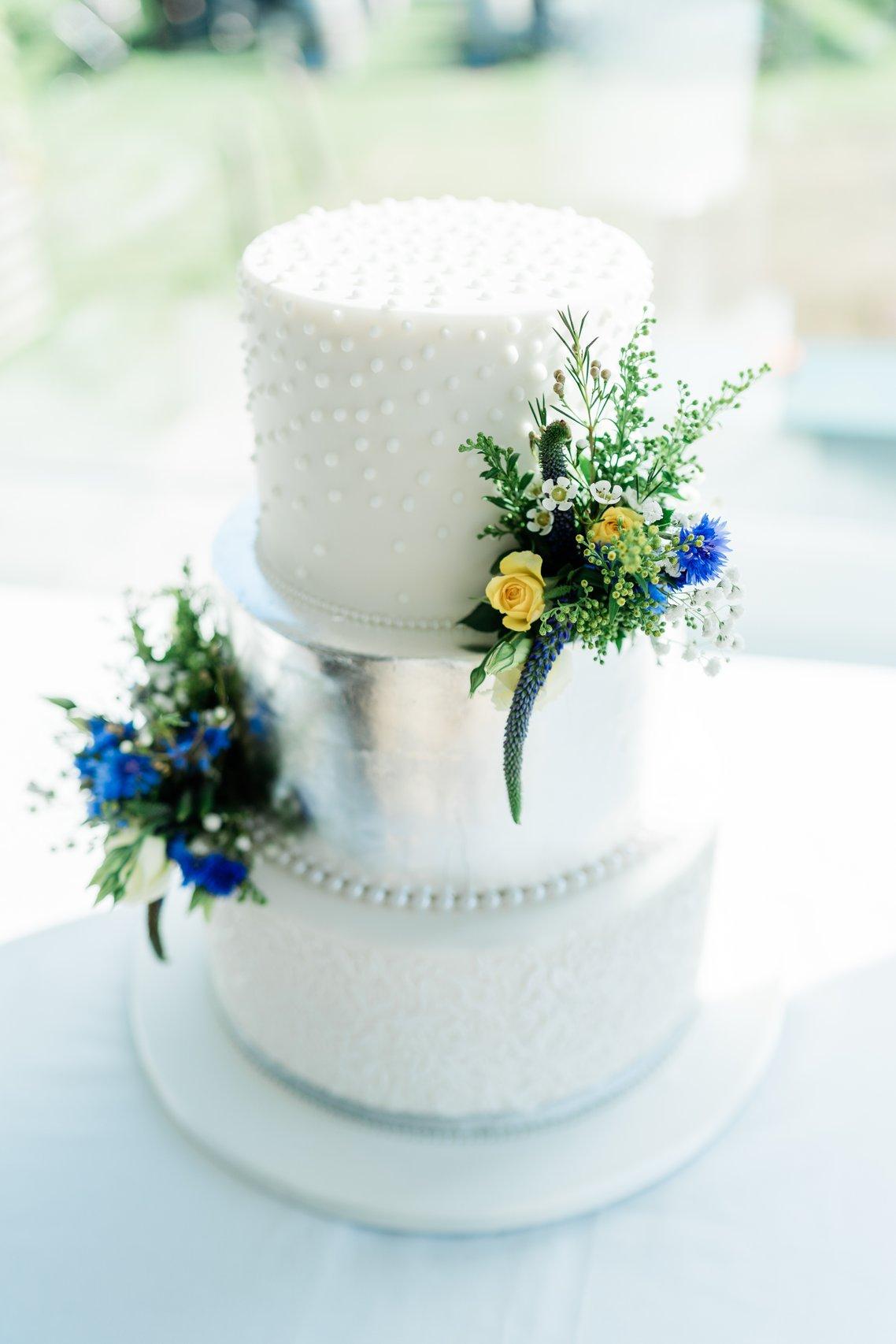 "The cake was beautiful. We had three tiers and each was a different flavour: dark chocolate, lemon and red velvet. We had one tier in silver leaf and used fresh flowers to decorate.
