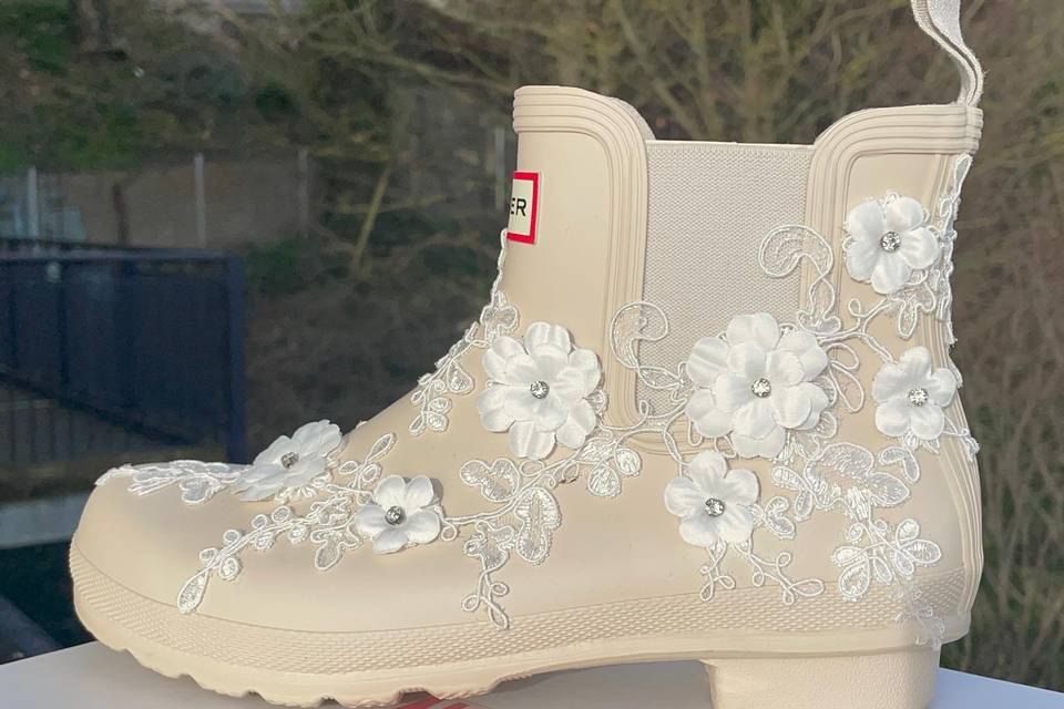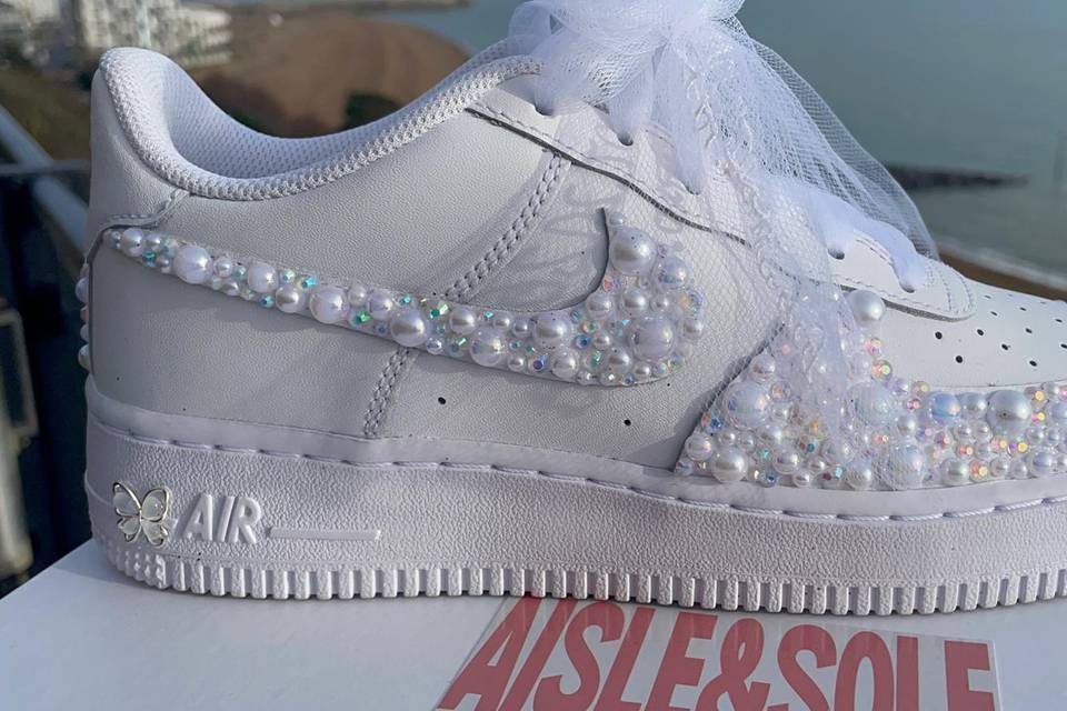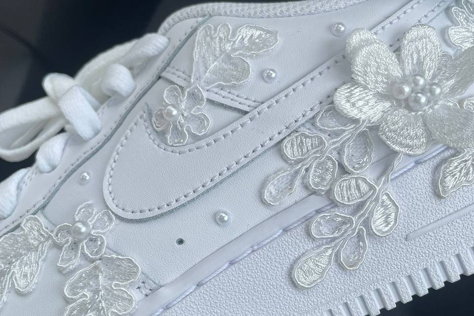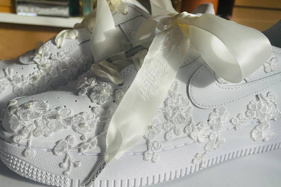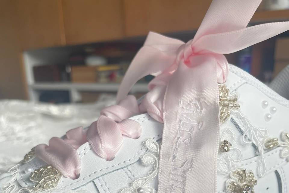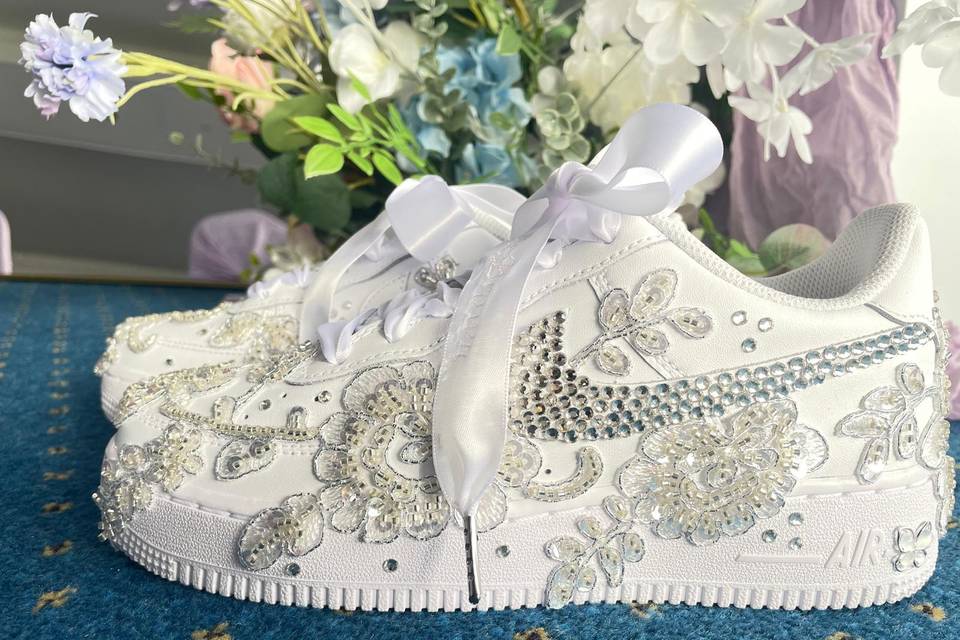 Every pair I create is handmade with the same dedication I give to bridal gowns. I start with high-quality base shoes and layer on intricate embellishments—dainty silk flowers, genuine crystals, elegant lace appliqués, and personalized touches like names or meaningful dates woven into satin ribbons. Whether it’s a classic white Air Force 1 transformed into a dreamy bridal masterpiece or a subtle heel accented with just the right sparkle, each design is made to complement your wedding day perfectly. We believe your wedding shoes should tell part of your love story: romantic, joyful, a little whimsical, and completely you. Thank you for stopping by and being part of this journey. We’d love to help bring your vision to life—whether it’s your own “something blue” (or pink, or ivory!) or a special gift for the bride in your life.