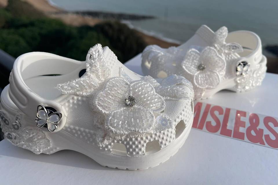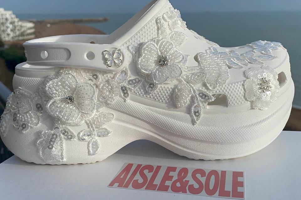 For over 30 years, I’ve been immersed in the wedding world, designing and crafting exquisite dresses for brides who want to feel like the most radiant version of themselves on their big day. There’s nothing quite like seeing a bride light up when she slips into something made just for her—it’s pure magic. A year ago, something wonderful happened. My dress clients started asking the same question over and over: “Slavka, where can I find shoes that match the elegance and personality of my gown? Something comfortable, unique, and unforgettable?” They wanted bridal sneakers or heels that felt luxurious yet walkable, covered in delicate lace, shimmering crystals, soft ribbons, and romantic details—without sacrificing style or comfort, I then went to my daughter and asked her how she would feel about designing these shoes with me, she agreed and we took this challenge on together. I realized there was a gap no one was truly filling with the same level of care and craftsmanship I put into dresses. So, with a lot of excitement (and a few late nights experimenting with beads, pearls, and silk flowers), Aisle & Sole was born.